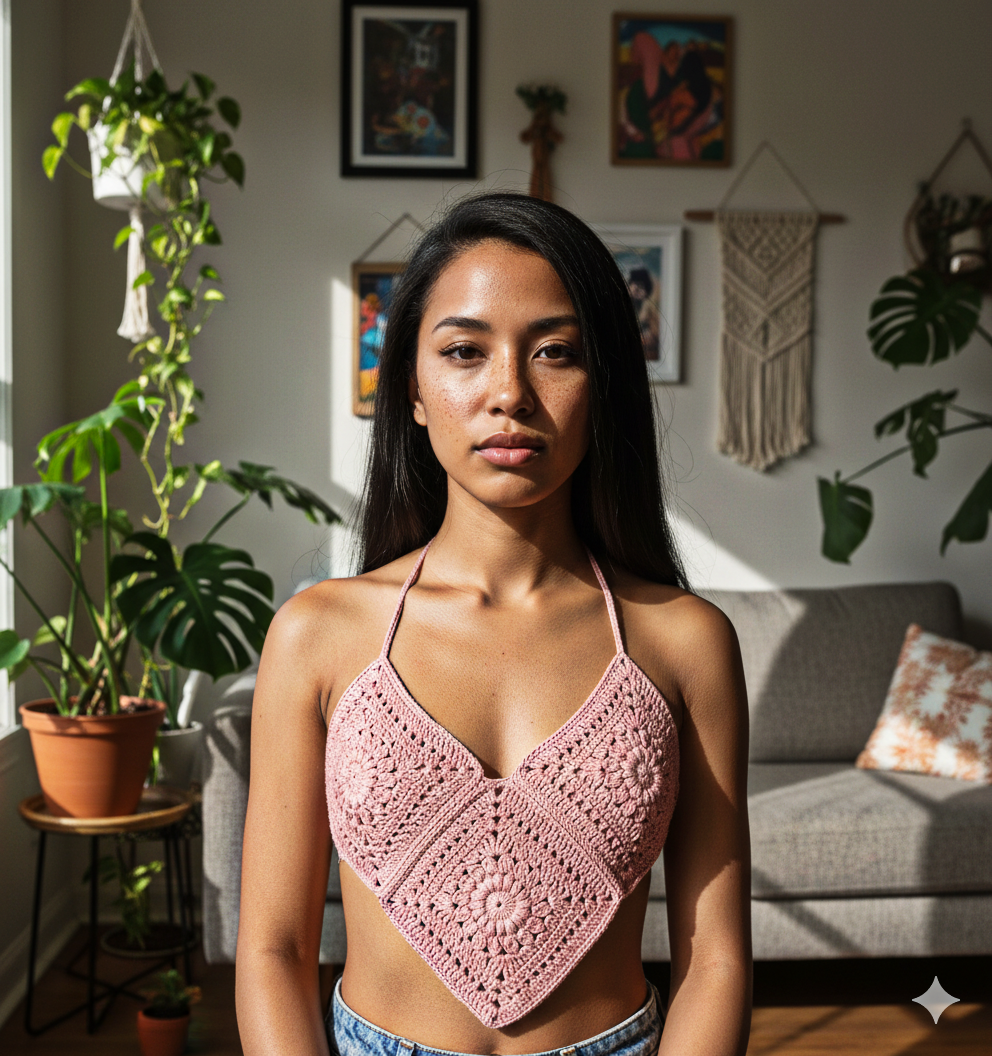 Cropped feito em crochê, com fio 100% algodão mercerizado, na cor rosa. Modelo frente única. Veste PP.